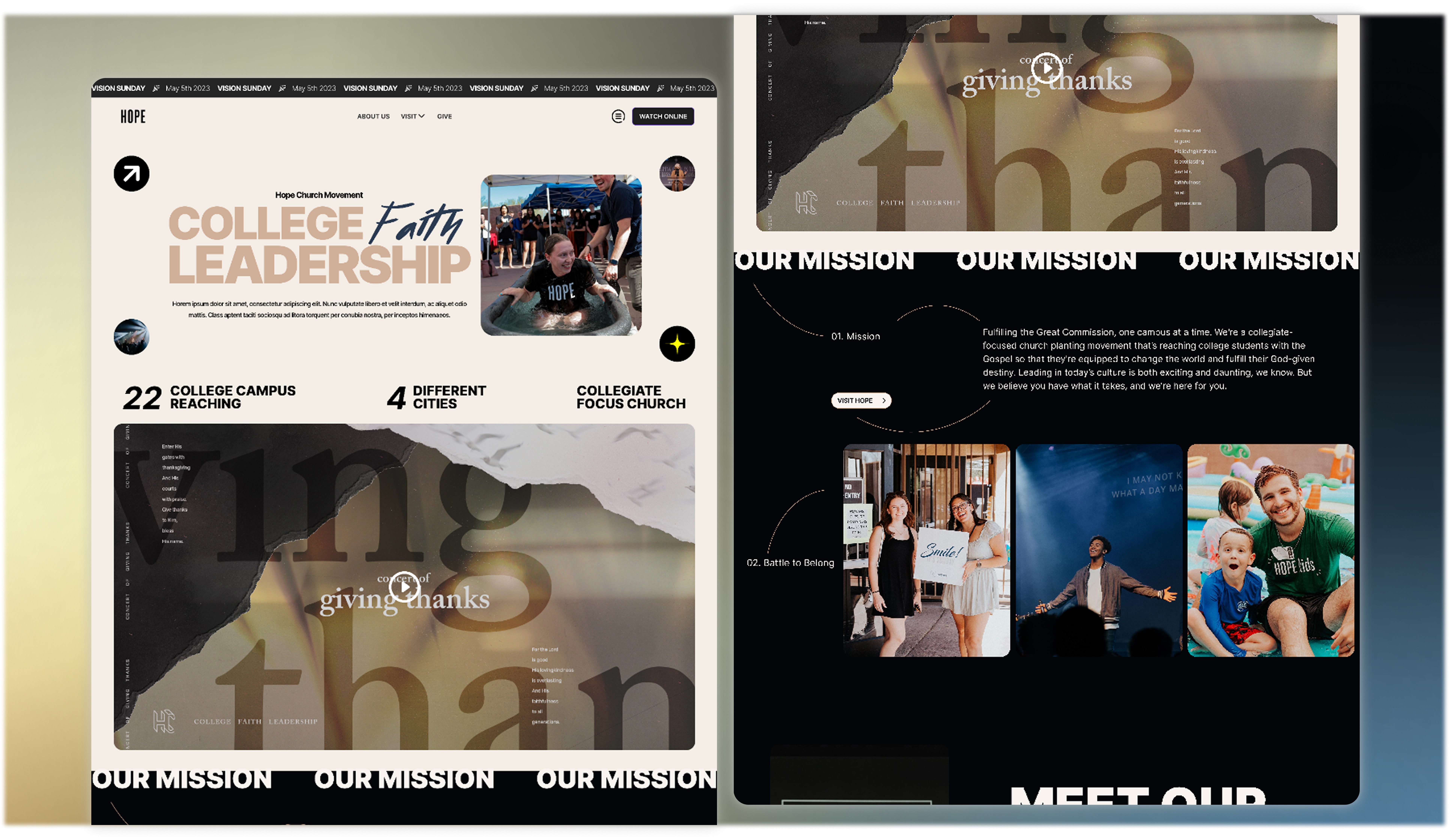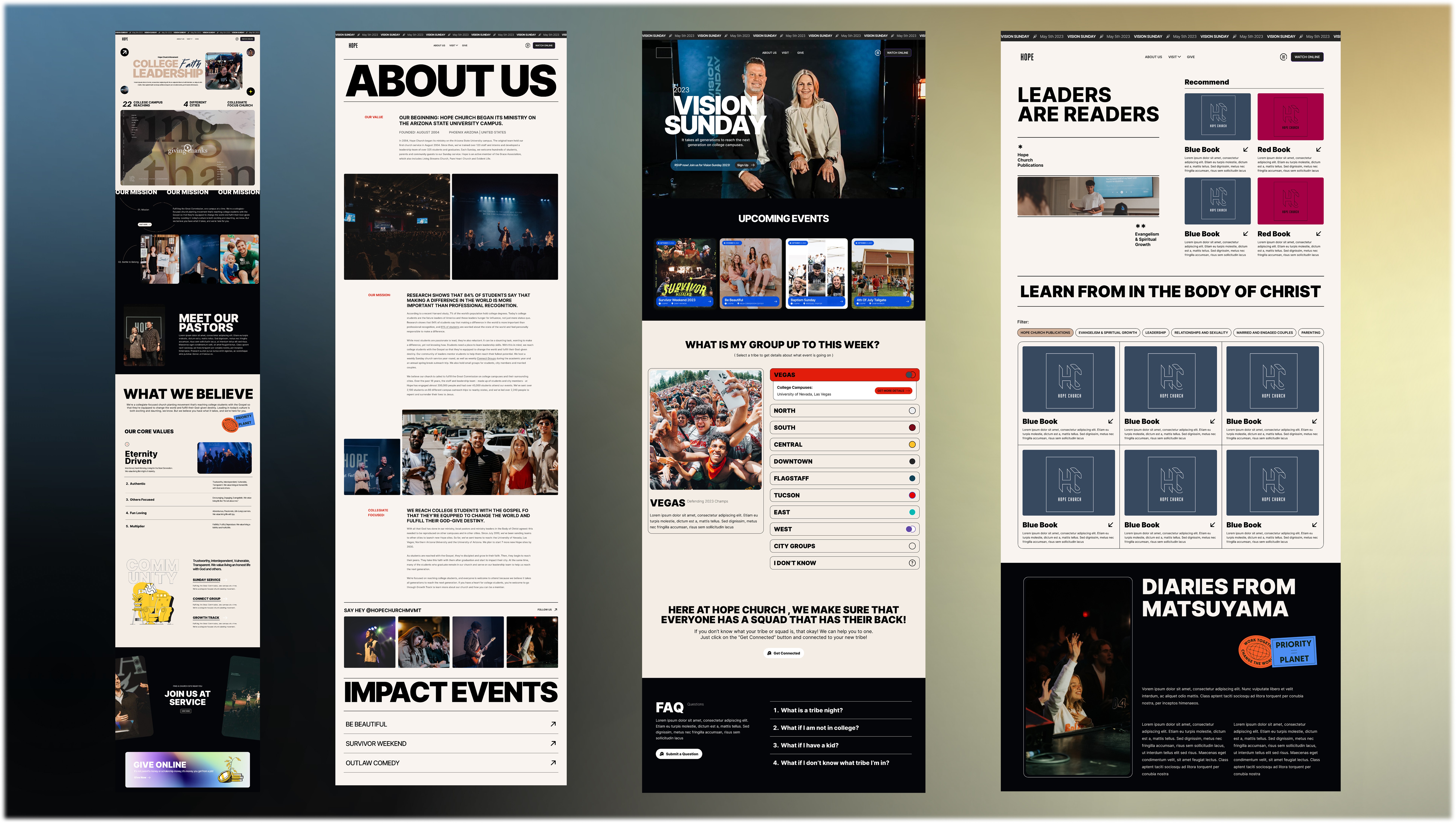 Building on the momentum of my first SaaS build, I channeled my growing UI/UX skills into a community I actively serve. As a leader on the Hope Church video team, I architected a complete conceptual web redesign tailored to the vibrant, collegiate-focused energy of our congregation. Using Figma and modern no-code platforms, I mapped out an entirely new digital front door—from the home page to the resource hub—to prove how intentional design can amplify a mission and better connect with students.